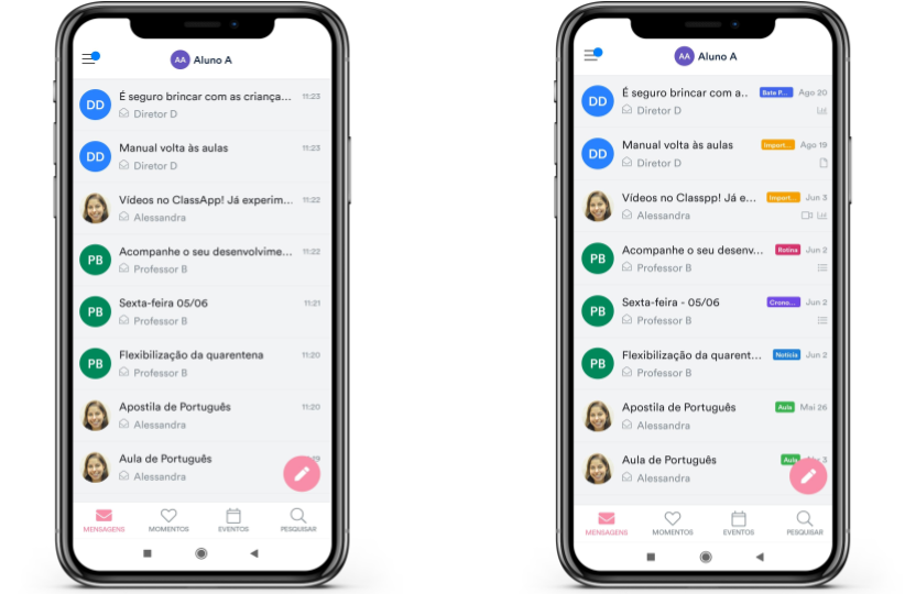 Além de permitir que os pais já tenham uma prévia sobre o assunto da mensagem, essa funcionalidade ajuda a organizar a caixa de entrada do da agenda digital escolar ClassApp das famílias.